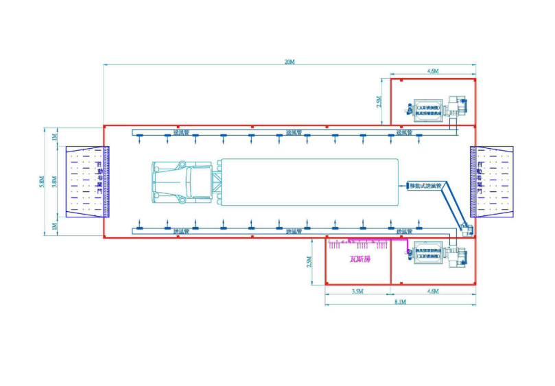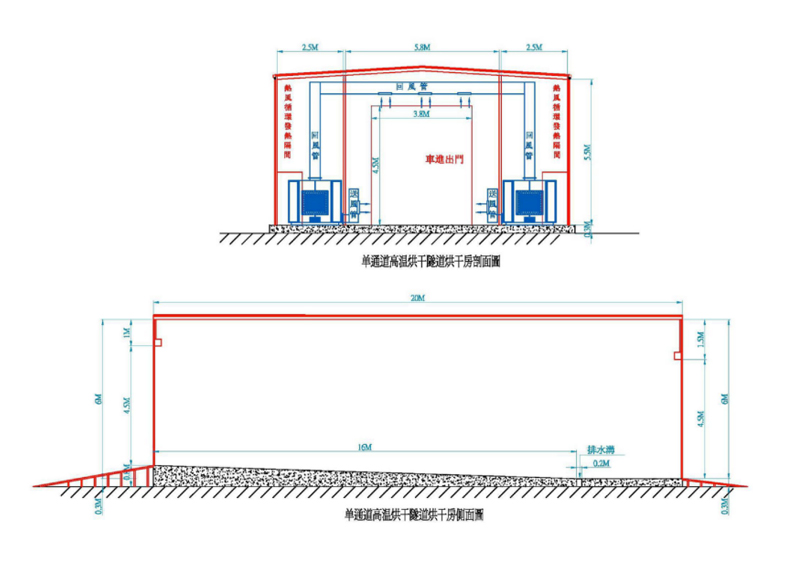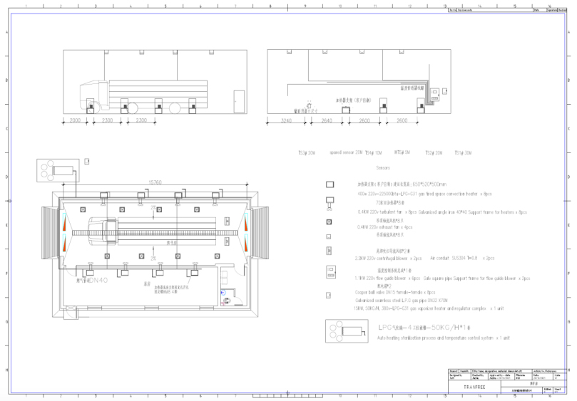 Источник тепла для сушки состоит из восьми газовых двигателей прямого сгорания 70 кВт, положительное давление для подачи воздуха, независимо от начала и остановки, управляется соответствующим температурным зондом, когда температура достигается, нагреватель сначала выключает пламя и газ, внутренняя воздуходувка будет работать в течение одной минуты после рассеивания остаточного тепла в режиме ожидания, ожидая следующего сигнала нагрева;